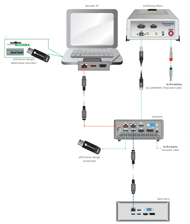 借助TurboLink,我們現在提供了一種解決方案來實現這一目標:高精度和快速數據訪問!TurboLink 與您的actiCHamp (Plus)和BrainVision Recorder設置集成。它通過用戶數據包協議 (UDP) 將來自 actiCHamp (Plus) 的 EEG 數據傳輸到您首選的數據客戶端,該客戶端正在執行數據處理。Recorder PC 用于通過 TurboLink 配置 actiCHamp (Plus),并以 BrainVision 文件格式監控或記錄數據以進行驗證或離線分析。請參閱下面可視化的設置示意圖。