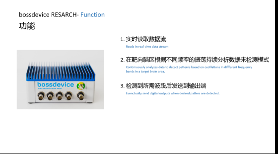 bossdevice RESEARCH:是一個由硬件和軟件算法組成的實時數字信號處理器。它旨在從生物信號放大器(腦電圖,EEG)讀取實時原始數據流,持續分析該數據并根據不同頻率的振蕩檢測模式。