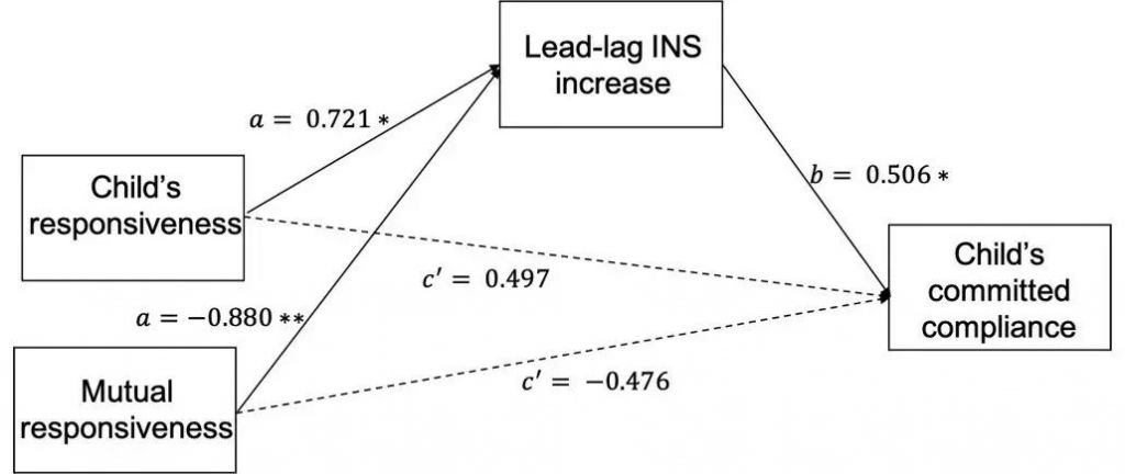 結果發現,在親子互動過程中,兒童對母親的回應頻率可以顯著預測兒童的約束性順從行為比例。并且,兒童在母子互動中的主動回應越多,母子在顳頂聯合區的大腦活動同步就越強,兒童的順從行為就越多(中介效應,見圖3)。相反,母親對兒童的回應頻率與兒童順從行為無關。特別是,母子雙方交互的頻率越多,反而顯著降低了母子間的大腦活動同步,進而對兒童的順從行為產生不利影響。