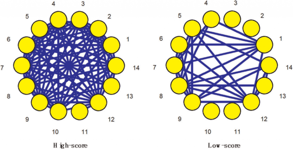 FIGURE 1 Examples of the multi‐brain network in the right inferior frontal gyrus for high‐ and one low‐score ads