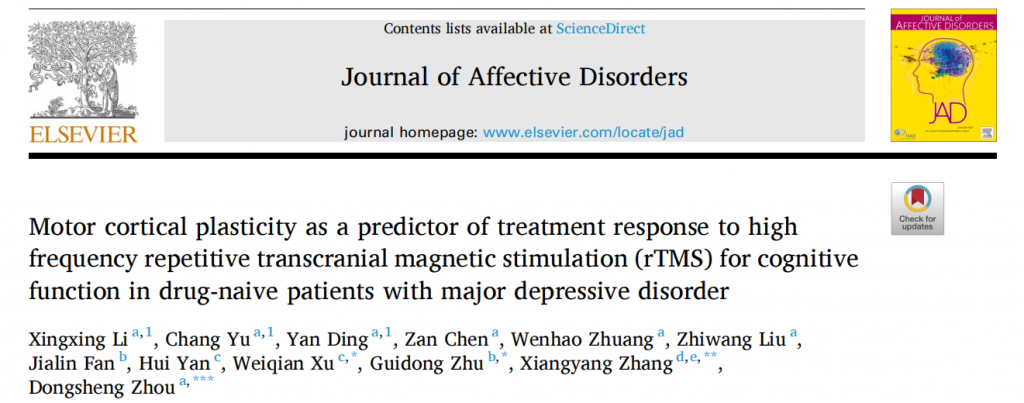 2023年5月來自寧波市康寧醫院(寧波大學附屬精神衛生中心)周東升主任團隊在Journal of Affective Disorders(IF=6.6)發表的文獻提出運動皮質可塑性可以作為一個預測MDD患者認知改善的潛在生物標志物。