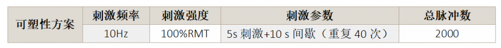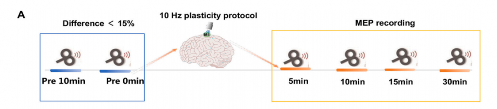 取20個5s間隔連續的運動誘發電位(MEPs)的平均值,并測量其峰值。取兩個基線值點(間隔10min),如果兩個基線值之間的差異小于15 %,則使用可塑性方案。在可塑性方案后的5、10、15和30min測量MEPs。測量MEP值(從峰值到基線)的變化,以評估TMS前后長時程增強樣(LTP)運動皮質可塑性。