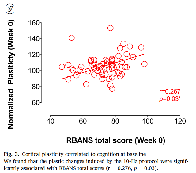 3.TMS增強皮質可塑性,皮質可塑性增強與認知能力改善相關TMS干預4周后,與假刺激組相比,TMS干預的患者的MEP值增強。此外,可塑性增強(10分鐘時間點)與總RBANS和即時記憶評分的改善顯著相關。然而,在假刺激組中沒有發現類似的相關性,這表明皮質可塑性的改善可能反映了認知能力改善的程度。