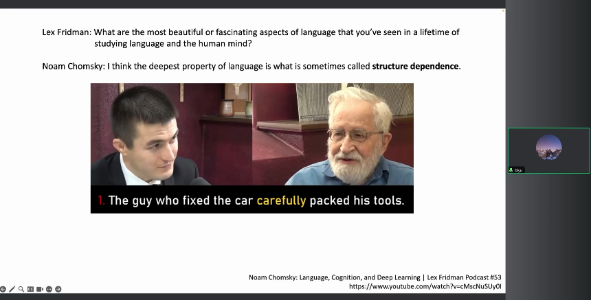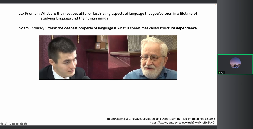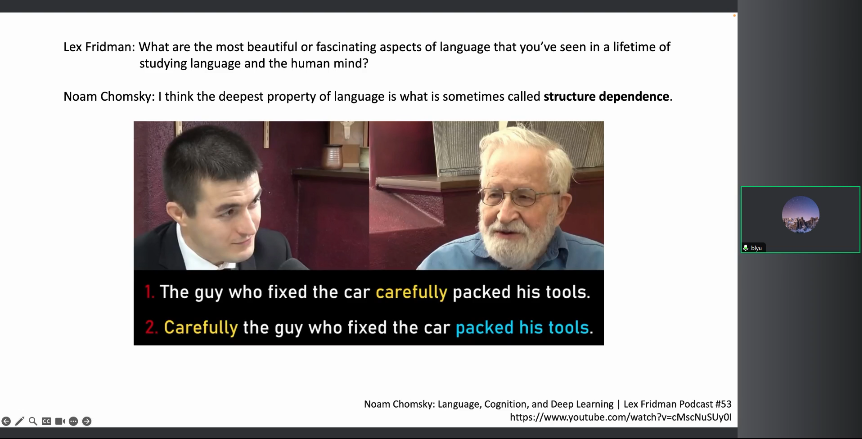 今天的分享我想首先從一個采訪開始。畫面左邊的是主持人,右邊的這位長者叫做Noam Chomsky。他可以說是過去幾十年甚至一個世紀以來最偉大的認知科學家和語言學家。他最著名的理論就是他提出的語言加工的結構化表征。他憑一己之力對語言學研究帶來了革命性的推動及發(fā)展。