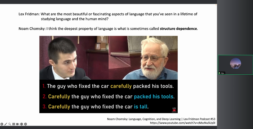 Chomsky回答道:“我覺得語言最深刻的特性叫做structure dependence。”也就是結構依賴。他通過一句話“The guy who fixed the car carefully packed his tools”來進行解釋。在這句話中,里面標黃的副詞‘carefully’,修飾的是‘packed’這個詞。兩個詞離得非常近,我們在整合句子意思時,會把兩個詞整合在一起,理解為“小心翼翼地打包”。