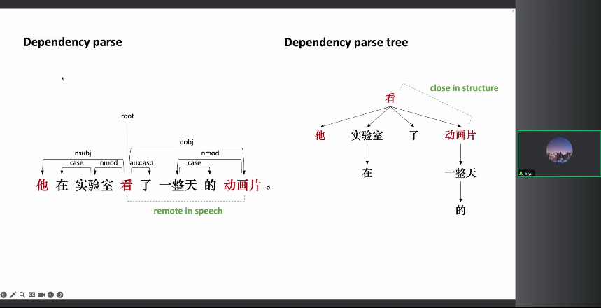 這個現象或者說規(guī)律并不只是對英語成立的,對我們中文及所有語言都是成立的。 比如說這句話,“他在實驗室看了一整天的動畫片”。我們在理解這句話的時候,會把看和動畫片緊密的關聯在一起,看動畫片的動作是自然而然的就在我們大腦中出現的。 雖然兩者之間還隔了“一整天的”這樣一段語音,但是我們的大腦還是能夠自然而然的把看和動畫片整合在一起。原因就像剛才的英語句子一樣,在這個中文例子的句法樹結構中,看和動畫片是更為接近的。