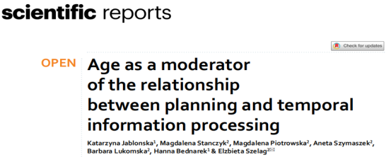 本研究Age as a moderator of the relationship between planning and teImporal information processing發(fā)表于2022年的Scientific Reports(IF:4.6),華沙社會科學(xué)與人文大學(xué)的Katarzyna Jablonska等人為本文的第一作者。