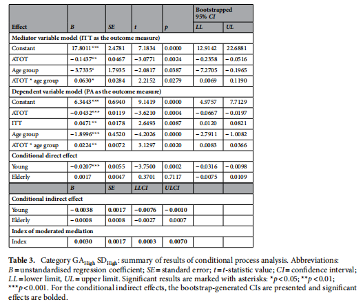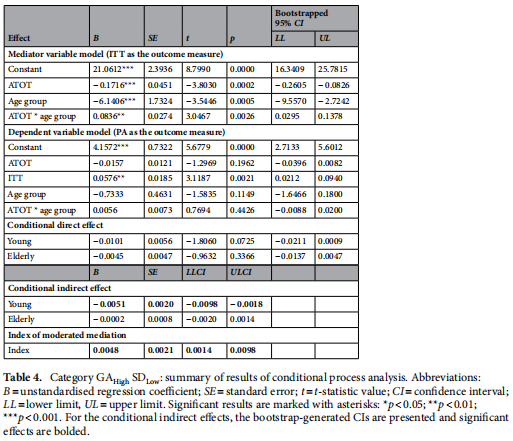 同樣的,年齡通過ITT調(diào)節(jié)了ATOT對PA的間接作用(IMM不含零:IMM=0.0030,CI=[0.0003, 0.0070])。在年輕組中具有顯著影響(B=-0.0038, CI=[-0.0076,-0.0010]),但在老年組中沒有顯著影響。