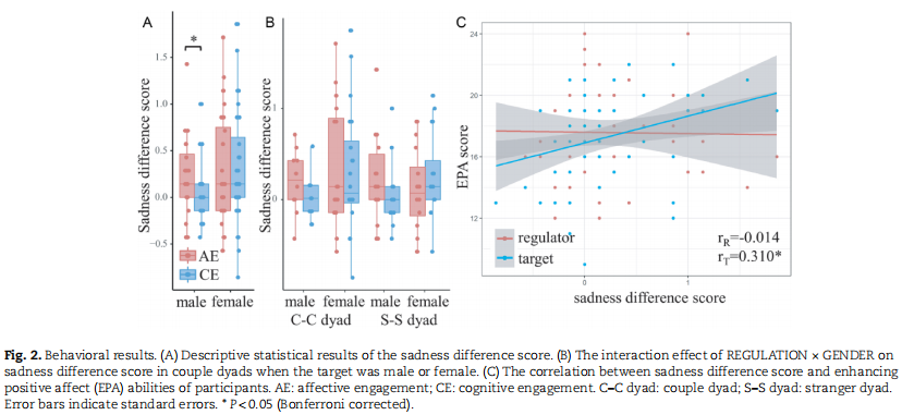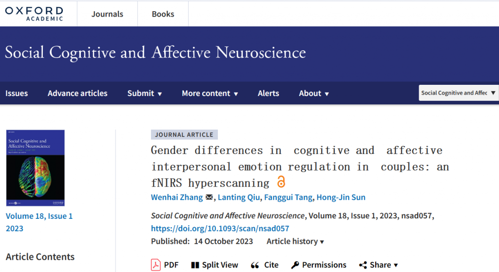 基于以上信息,2023年10月,衡陽師范學院教育神經科學與人工智能大數據中心張文海教授團隊采用近紅外超掃描技術探究情侶在人際情緒調節間的性別差異,此項研究Gender differences in cognitive and affective interpersonal emotion regulation in couples: an fNIRS hyperscanning發表在 Soc Cogn Affect Neurosci(IF:4.2)雜志。研究結果表明,在情侶使用人際情緒調節策略調節另一半的悲傷情緒的過程中,男性和女性被調節者的性別差異僅存在于認知投入上,但男女被調節者之間還存在一種可分離模式。