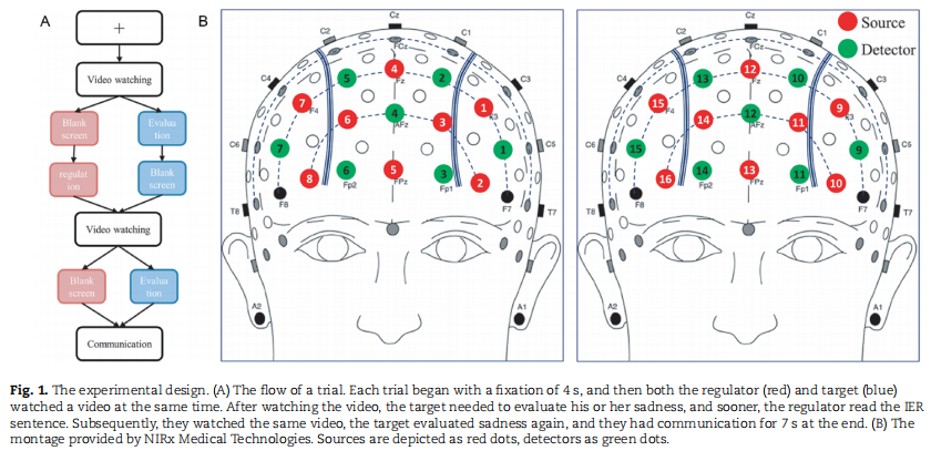 fNIRS數據采集:執行任務期間同時采集fNIRS數據,獲取興趣腦區信息,探頭布局如圖1所示。所用設備為臺式近紅外腦功能成像設備(NIRScout,深圳瀚翔腦科學技術股份有限公司國內總代理)。采樣率為7.8125Hz,記錄760和850nm兩個波長的原始數據。我們通過NIRx在兩個參與者的PFC上放置了兩組定制的光電器件(8個光源和8個探測器,20個測量通道)(圖1B),探討了情侶間情感投入和認知投入參與調節伴侶悲傷的神經機制,并特別關注了性別差異。