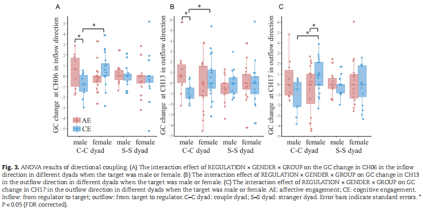 對于情侶來說,格蘭杰因果分析顯示,在認知投入過程中,男性被調節者CH06、CH13和CH17的神經活動低于女性被調節者。對于CH06和CH13(額極皮質)的流入和流出活動,男性被調節者在認知投入條件下的活性低于情感投入條件,而對于CH17(背外側前額葉皮質)的流出活動,女性被調節者在認知投入條件下的活性高于情感投入條件。然而,這些差異在陌生人身上沒有觀察到。