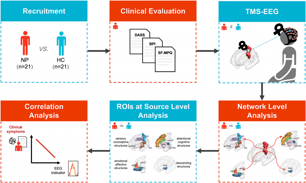 神經病理性疼痛(NP)是一種典型的難治性慢性疼痛,全球約有10%的人群深受其擾。近年來,非侵入性腦刺激(NIBS)技術在神經病理性疼痛方面展現出了巨大潛力。其中,重復經顱磁刺激(rTMS)和經顱直流電刺激(tDCS)等技術備受關注。然而,關于rTMS鎮痛作用在神經病理性疼痛中的神經回路基礎,目前仍不明確。為了深入探究這一問題,研究采用了單脈沖經顱磁刺激(TMS)結合腦電圖(EEG)評估大腦皮層的不同連接性。通過TMS-EEG,研究者能夠對關鍵通路的電流傳播進行表征,包括下行通路、注意力認知疼痛通路以及情感疼痛通路。研究中還引入了兩個重要的指標:顯著電流密度(SCD)和顯著電流傳播(SCS)。顯著電流密度是對TMS誘發EEG活動的局部源電流密度的度量,而顯著電流傳播則是從TMS靶點(M1)到特定腦區電流擴散的累積距離。
