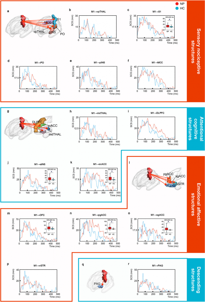 在注意力認知結構方面,神經病理性疼痛患者同樣呈現出獨特的電流傳播特征。M1至前島葉(aINS)和胼胝體上部前扣帶回(scACC)的電流傳播顯著增加,且這一現象同樣集中在220 - 240ms的時間段。這提示神經病理性疼痛可能影響了大腦對疼痛相關注意力和認知資源的分配,導致患者對疼痛的注意力過度集中以及認知加工過程的異常。