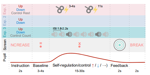 在這里,只報(bào)告基于瞳孔的生物反饋訓(xùn)練第3天的數(shù)據(jù),同時(shí)記錄了腦電圖和心電圖數(shù)據(jù)。在每次訓(xùn)練中,受試者共進(jìn)行60個(gè)試次,分為3個(gè)上調(diào)和3個(gè)下調(diào)block,每個(gè)block由10個(gè)試次組成。實(shí)驗(yàn)開始時(shí),對瞳孔大小的調(diào)節(jié)方向進(jìn)行2秒的提示(放大或縮小瞳孔大?。缓筮M(jìn)行3秒的基線測量。在接下來的實(shí)驗(yàn)中,受試者在調(diào)節(jié)階段運(yùn)用他們的心理策略來調(diào)節(jié)瞳孔直徑的大小。