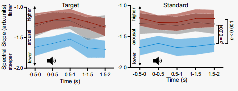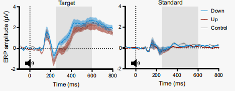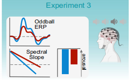 實(shí)驗(yàn)3將瞳孔生物反饋與腦電相結(jié)合,研究瞳孔自我調(diào)節(jié)如何影響目標(biāo)音調(diào)的譜斜率和P300事件相關(guān)電位(ERP)成分,這是藍(lán)斑(LC)活動(dòng)的電生理標(biāo)志物。研究假設(shè)瞳孔縮?。ㄋ{(lán)色)時(shí)的斜度比瞳孔放大(紅色)時(shí)的斜度更陡,并進(jìn)一步研究斜度是否會(huì)隨著目標(biāo)色調(diào)的變化而變化。此外,研究假設(shè)當(dāng)受試者在目標(biāo)音調(diào)之前瞳孔縮?。ㄋ{(lán)色)時(shí),P300會(huì)比瞳孔放大(紅色)時(shí)更大。圖4中的聲音圖標(biāo)代表在oddball任務(wù)中播放的標(biāo)準(zhǔn)(淺灰色)和目標(biāo)音調(diào)(深灰色)(圖4)。
