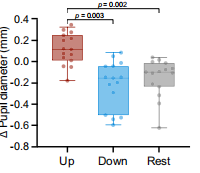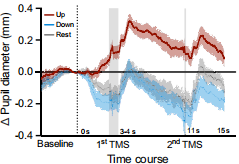 圖6 在每次經(jīng)顱磁刺激脈沖前的 150 毫秒內(nèi),在上調(diào)、下調(diào)和對照條件下,瞳孔大小均有所變化。