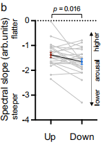 實(shí)驗(yàn)2將基于瞳孔的生物反饋與腦電圖相結(jié)合,研究瞳孔自我調(diào)節(jié)如何影響譜斜率(一種覺醒的皮層標(biāo)記物)。本研究假設(shè),與瞳孔縮小時(shí)(藍(lán)色)相比,在瞳孔放大(紅色)(表明更高的喚醒)期間,光譜斜率(皮質(zhì)喚醒的全局標(biāo)記)更平坦。右邊的條形圖顯示了估計(jì)的譜指數(shù)(圖3)。