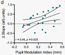 瞳孔調(diào)節(jié)指數(shù)(上調(diào) - 下調(diào))與頻譜斜率變化(上調(diào) - 下調(diào))之間存在顯著的正相關(guān),因此,更好的瞳孔自我調(diào)節(jié)與更大的頻譜斜率差異相關(guān)(圖10)。