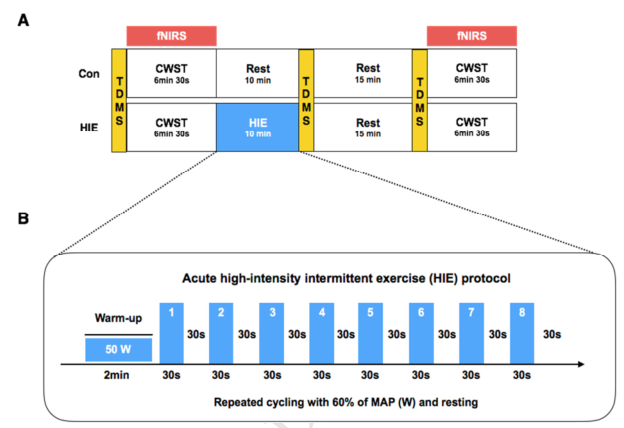 25名青年被試(21.0±1.6歲;9名女生)參與了平衡設(shè)計(jì): 在整個(gè)實(shí)驗(yàn)過程中,分為HIE高強(qiáng)度訓(xùn)練實(shí)驗(yàn)組和控制組,實(shí)驗(yàn)組先執(zhí)行顏色Stroop范式并進(jìn)行近紅外測(cè)量,時(shí)間6分半,然后實(shí)驗(yàn)組進(jìn)行HIE任務(wù)(HIE階段包括了兩分鐘的熱身運(yùn)動(dòng)(50W負(fù)載/60轉(zhuǎn)/分)和8組30秒的自行車運(yùn)動(dòng)(有氧最大功率的60%即127W±29.5負(fù)載/100轉(zhuǎn)/分),組之間休息30秒),控制組休息,15分鐘休息后再次進(jìn)行顏色Stroop范式測(cè)量和近紅外腦功能成像系統(tǒng)測(cè)量。