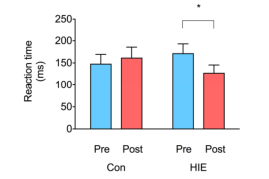行為結(jié)果 在Stroop結(jié)果中,實(shí)驗(yàn)對(duì)比了HIE(高強(qiáng)度訓(xùn)練組)和控制組之間的stroop效應(yīng)對(duì)比(不一致和中性條件下),發(fā)現(xiàn)只有高強(qiáng)度間歇性訓(xùn)練的組別有明顯的stroop成績(jī)的提高,說明了進(jìn)行HIE高強(qiáng)度間歇性訓(xùn)練能夠帶來認(rèn)知提高。