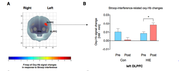 近紅外結(jié)果 在進(jìn)行近紅外成像結(jié)果分析和樣本數(shù)據(jù)T檢驗(yàn)后,發(fā)現(xiàn)只有左背外側(cè)前額葉在前后的stroop測(cè)量中有明顯的激活,如圖B所示,可發(fā)現(xiàn)在控制組中前后測(cè)量的左背外側(cè)前額葉沒有任何的顯著改變甚至還降低了反應(yīng),而間歇性高強(qiáng)度訓(xùn)練組在前后的stroop測(cè)量中表現(xiàn)為明顯的左背外側(cè)前額葉激活,并具有顯著差異。