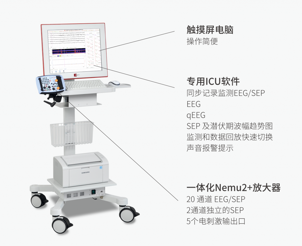 意大利EB Neuro公司的Nemus2+腦功能監測系統具有針對ICU監測設計的硬件和專用軟件,針對性強,可輕松實現ICU內腦功能監測。是目前唯一一款可以同時監測腦電和體感誘發的腦功能監護產品。EEG和SEP結合使用的臨床價值主要在于: