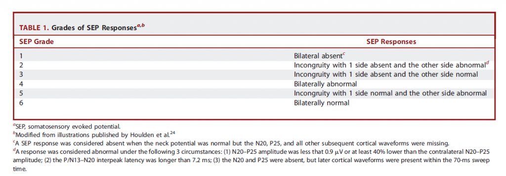 參考文獻:Sun, Y., Yu, J., Wu, J., Wu, X., Yuan, Q., Wu, X., ... & Hu, J. (2014). Predictive value of somatosensory evoked potentials for patients with severe traumatic brain injury. Neurosurgery, 61(CN_suppl_1), 171-174.