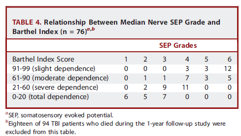 我們的研究證明SEP級別和患有重度創傷性腦損傷1年后的預后之間有顯著相關,尤其是用SEP級別1來預測不良預后(特異性100%),SEP級別6預測良好預后(特異性為97.8%)。然而,當缺少雙側SEPs時,在預測重度TBI患者的不良預后應該更謹慎。SEPs的缺少不能作為撤銷治療的唯一預測因子。對于SEP級別為2-5的患者,可能有多種結果。還需要進一步研究來分析其和患者功能預后之間的關系。