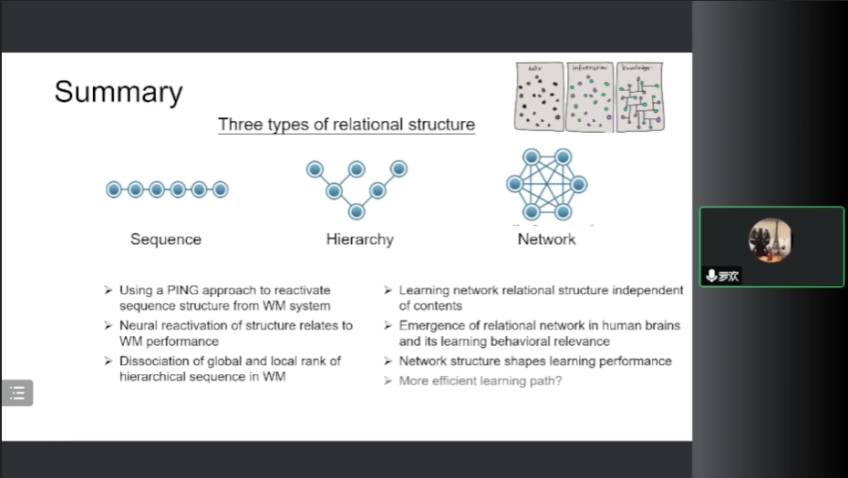 我今天主要和大家介紹了三種類型的關系結構。包括序列、層級和網絡。在前面的序列和層級,介紹了我們開發出一種叫做沖擊響應的方法,在工作記憶的靜默態階段,可以把存儲在里面的結構信息給激發出來,包括處于序列中哪個位置,處于層級里的global rank還是local rank,并且發現他們和你的工作記憶層級是直接相關的。還有一個有趣的點是,我們發現內容和結構是分離的,并且即使都是結構,global結構和local結構也是分離的,可能是處于一個正交的神經表征中。